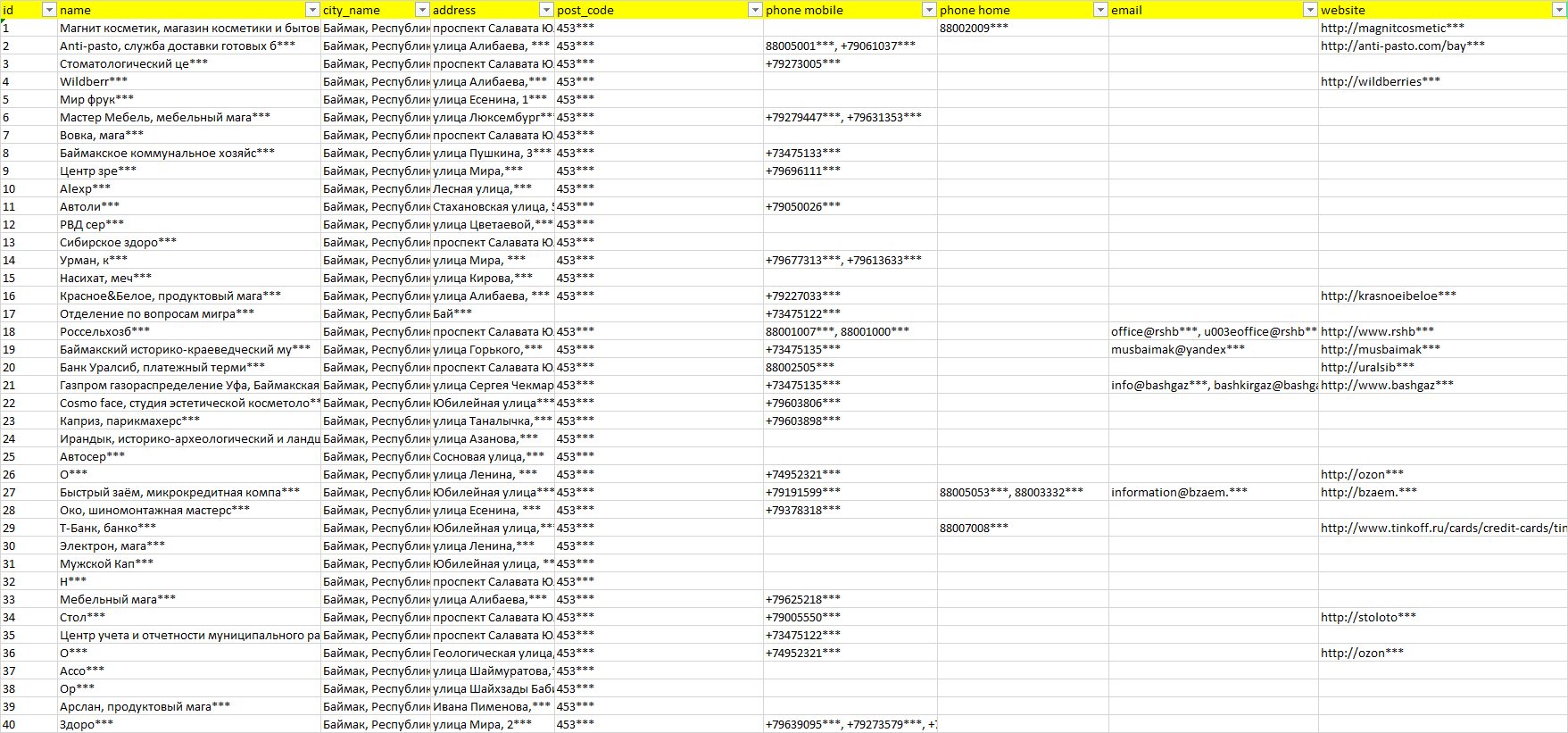 База организаций Баймак, вся Россия в формате Excel с эл. почтами, телефонами, сайтами, ссылками на соц сети, координатами и другой информацией. Скачайте демо версию, чтобы ознакомиться с данными.