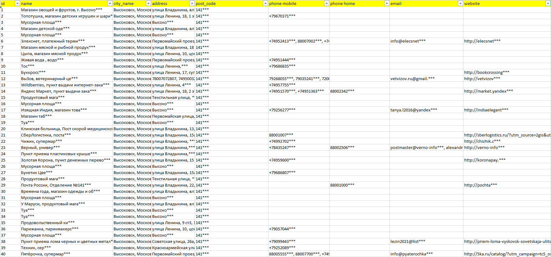 База организаций Высоковск, вся Россия в формате Excel с эл. почтами, телефонами, сайтами, ссылками на соц сети, координатами и другой информацией. Скачайте демо версию, чтобы ознакомиться с данными.