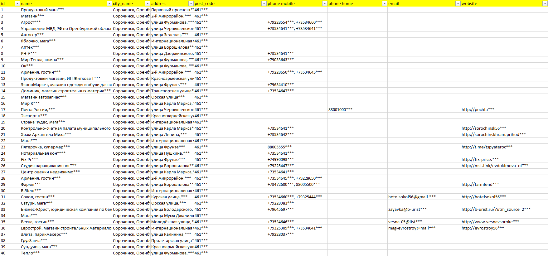 База компаний Сорочинск, вся РФ в формате Excel с эл. почтами, телефонами, сайтами, ссылками на соц сети, координатами и другой информацией. Скачайте демо версию, чтобы ознакомиться с данными.