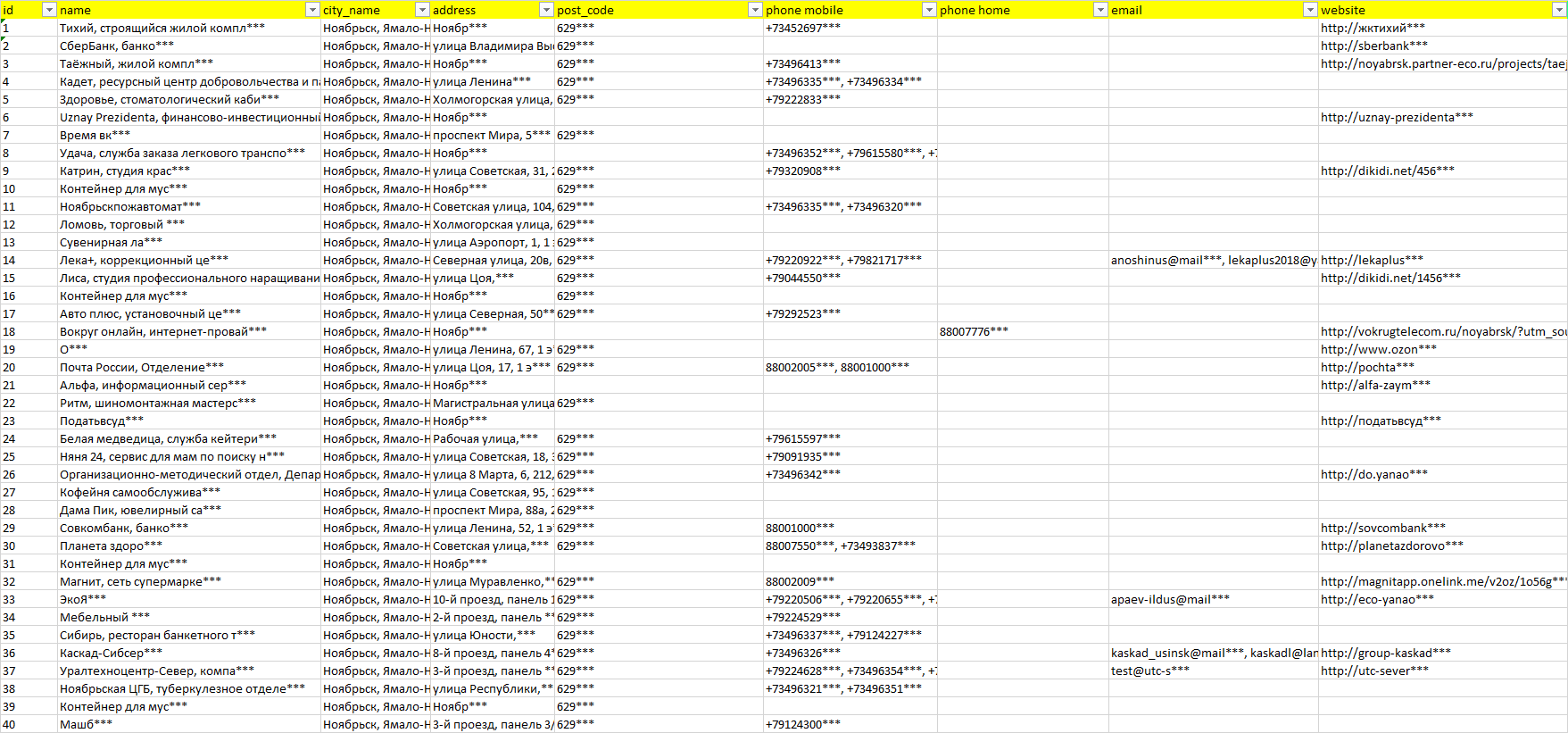 База организаций Ноябрьск, вся Россия в формате Excel с эл. почтами, телефонами, сайтами, ссылками на соц сети, координатами и другой информацией. Скачайте демо версию, чтобы ознакомиться с данными.