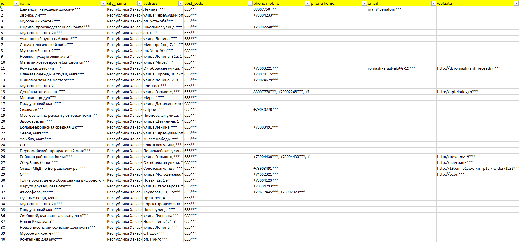 База организаций Республика Хакасия, вся Россия в формате Excel с эл. почтами, телефонами, сайтами, ссылками на соц сети, координатами и другой информацией. Скачайте демо версию, чтобы ознакомиться с данными.