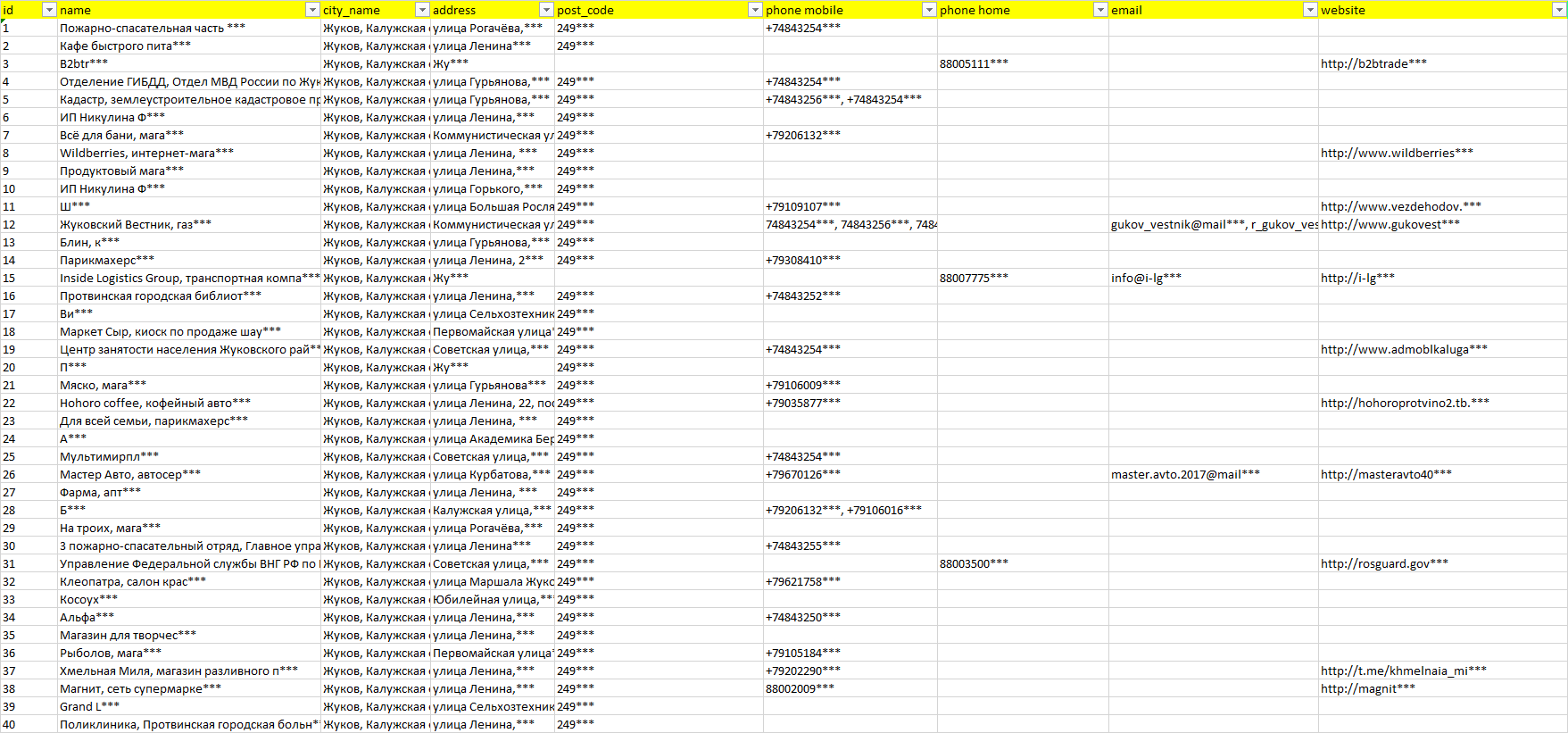 База компаний Жуков, вся РФ в формате Excel с эл. почтами, телефонами, сайтами, ссылками на соц сети, координатами и другой информацией. Скачайте демо версию, чтобы ознакомиться с данными.