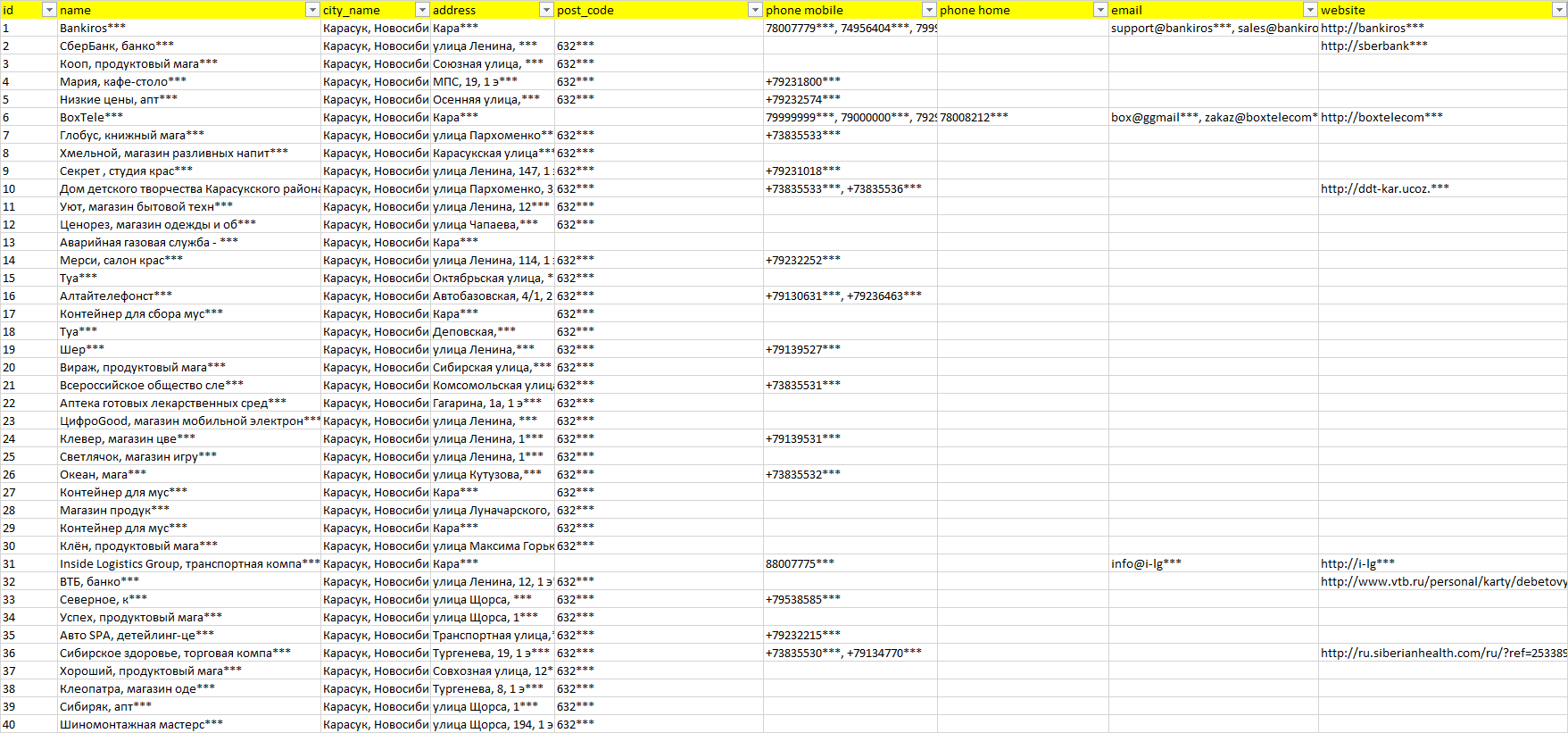 База организаций Карасук, вся Россия в формате Excel с эл. почтами, телефонами, сайтами, ссылками на соц сети, координатами и другой информацией. Скачайте демо версию, чтобы ознакомиться с данными.
