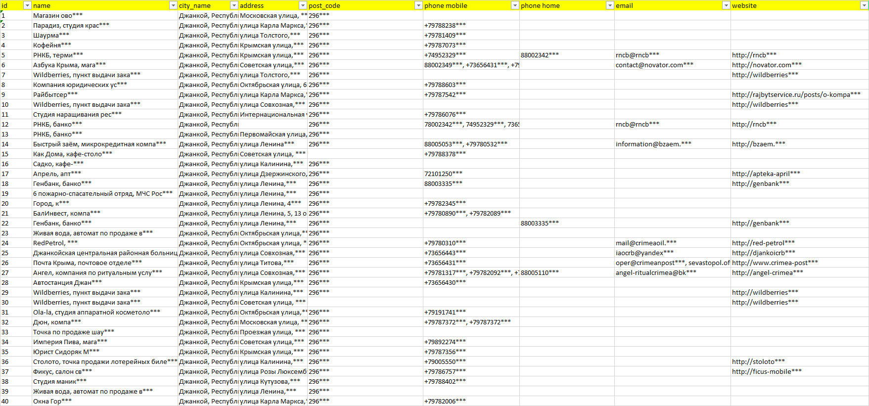 База организаций Джанкой, вся Россия в формате Excel с эл. почтами, телефонами, сайтами, ссылками на соц сети, координатами и другой информацией. Скачайте демо версию, чтобы ознакомиться с данными.