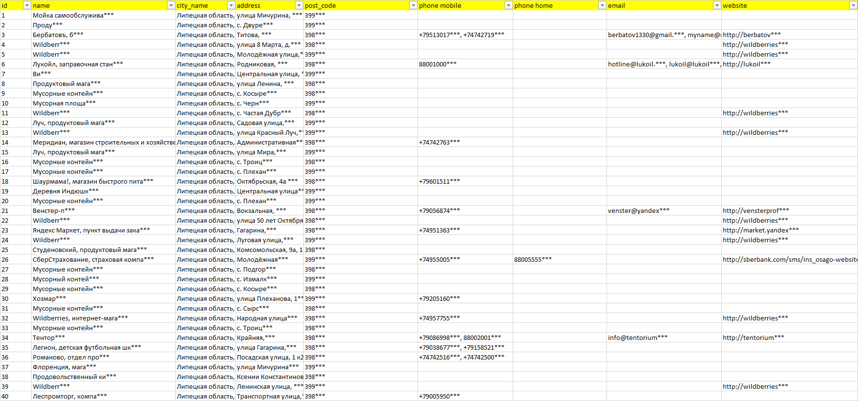 База компаний Липецкая область, вся РФ в формате Excel с эл. почтами, телефонами, сайтами, ссылками на соц сети, координатами и другой информацией. Скачайте демо версию, чтобы ознакомиться с данными.