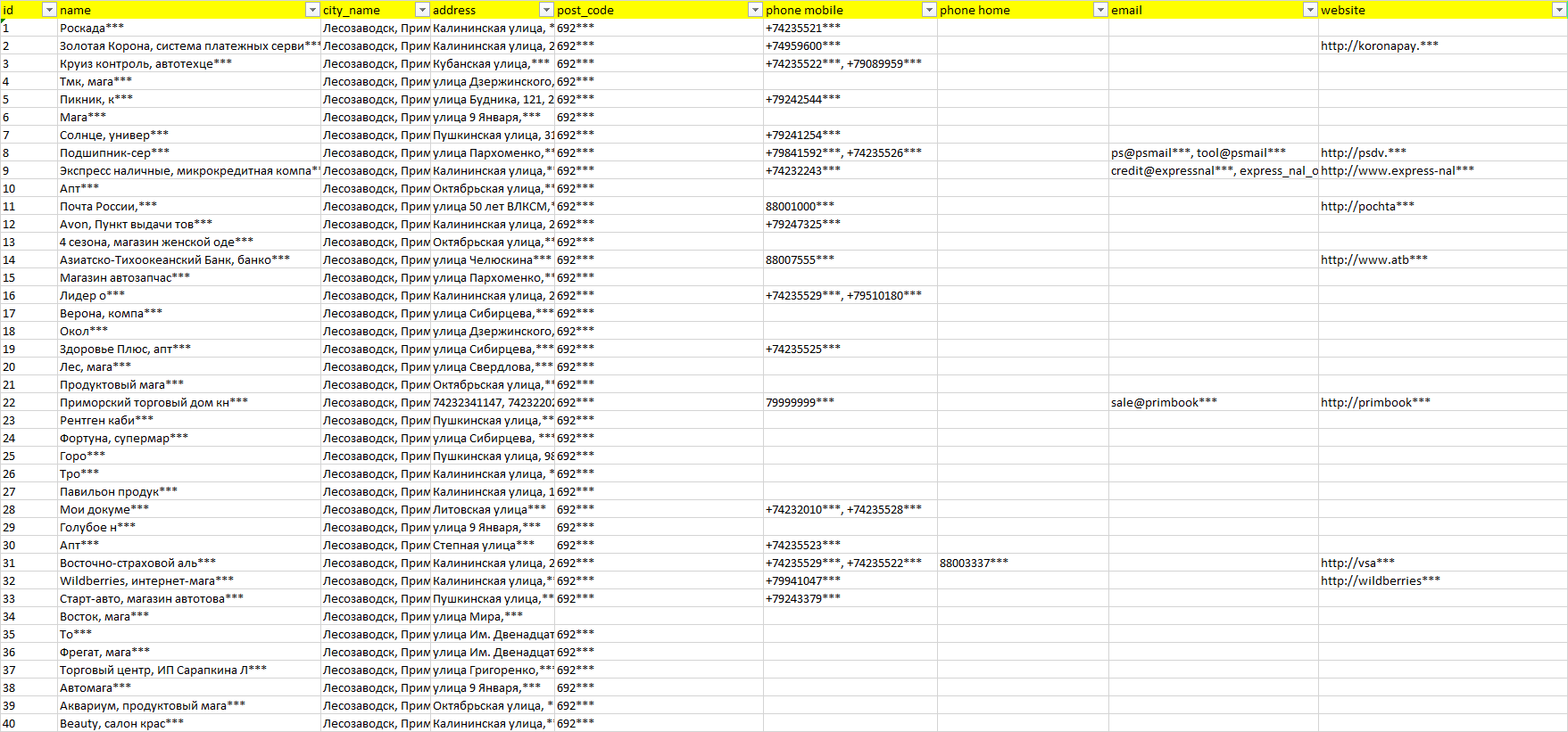 База организаций Лесозаводск, вся Россия в формате Excel с эл. почтами, телефонами, сайтами, ссылками на соц сети, координатами и другой информацией. Скачайте демо версию, чтобы ознакомиться с данными.