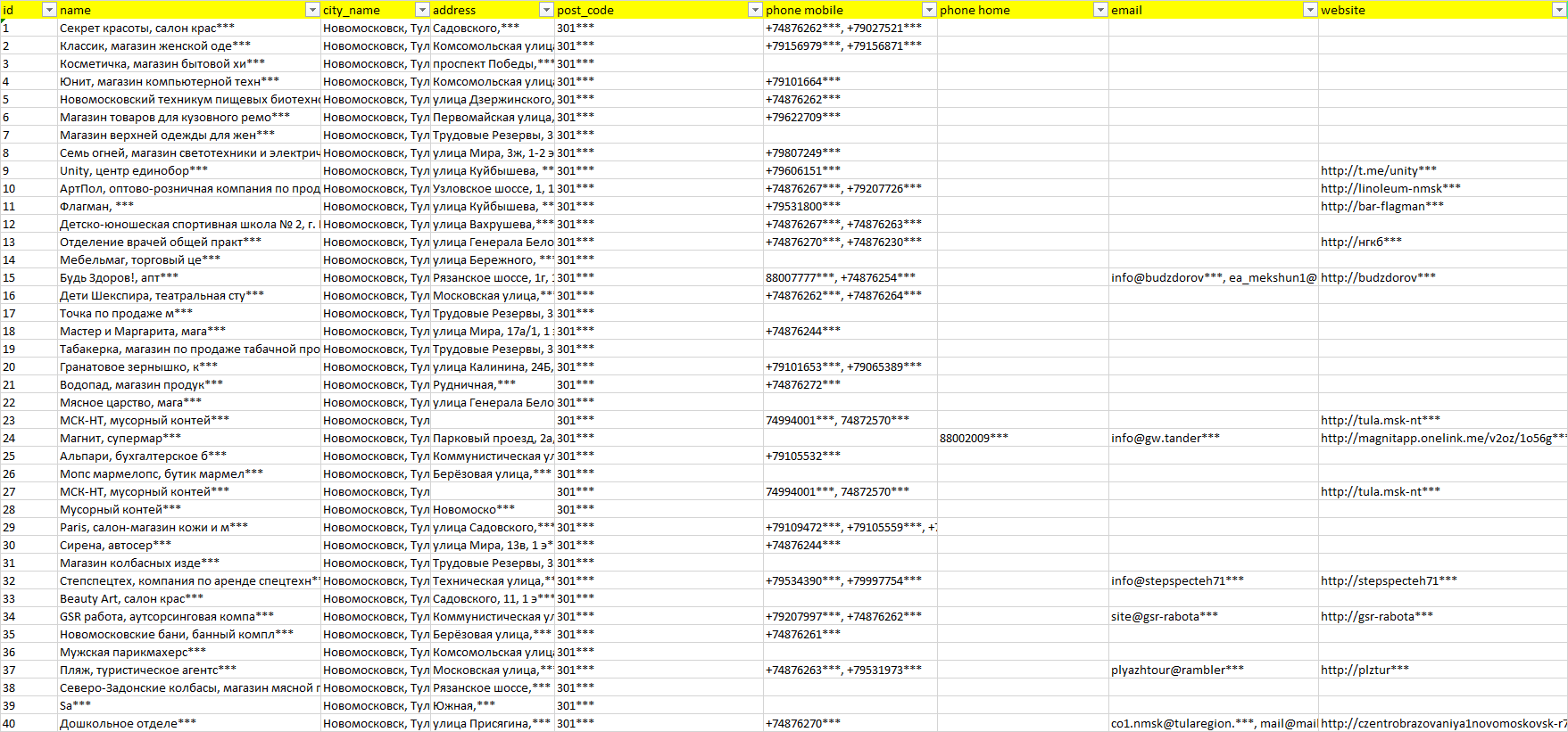 База организаций Новомосковск, вся Россия в формате Excel с эл. почтами, телефонами, сайтами, ссылками на соц сети, координатами и другой информацией. Скачайте демо версию, чтобы ознакомиться с данными.