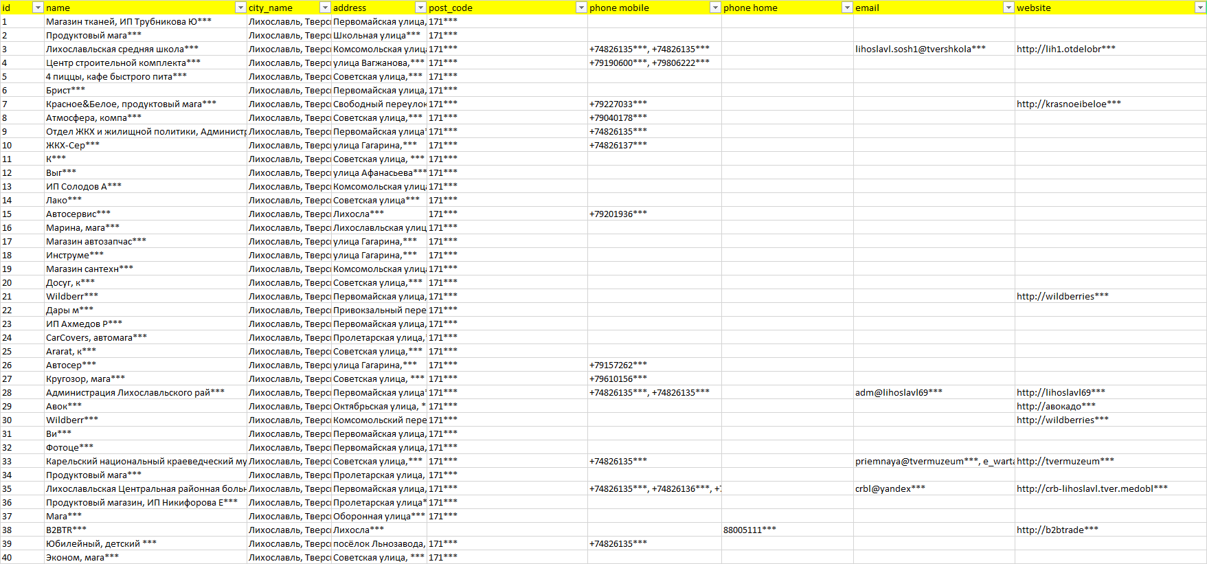 База организаций Лихославль, вся Россия в формате Excel с эл. почтами, телефонами, сайтами, ссылками на соц сети, координатами и другой информацией. Скачайте демо версию, чтобы ознакомиться с данными.