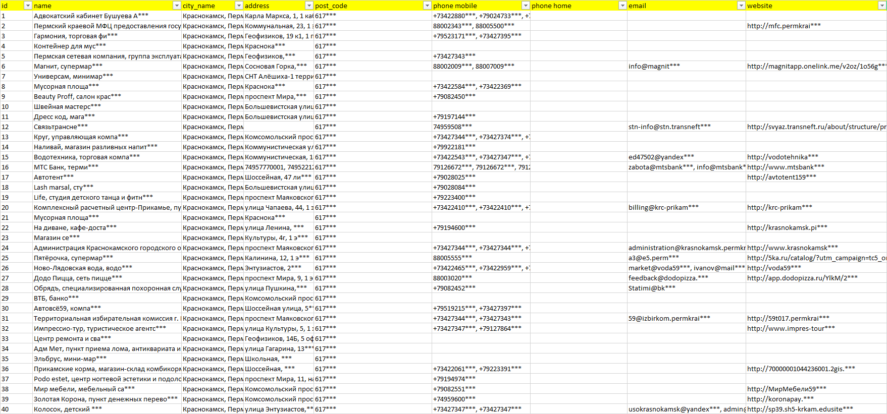 База организаций Краснокамск, вся Россия в формате Excel с эл. почтами, телефонами, сайтами, ссылками на соц сети, координатами и другой информацией. Скачайте демо версию, чтобы ознакомиться с данными.