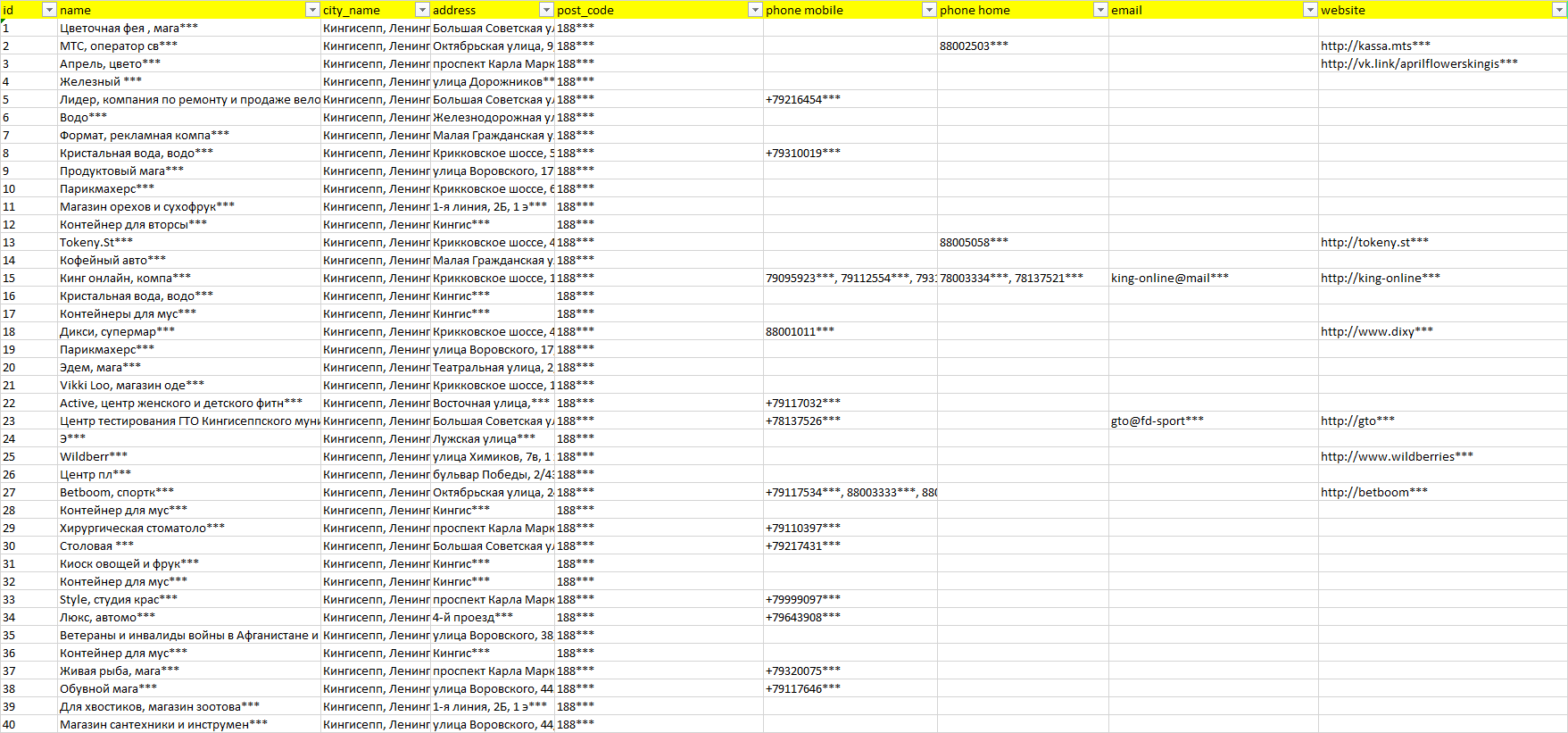 База организаций Кингисепп, вся Россия в формате Excel с эл. почтами, телефонами, сайтами, ссылками на соц сети, координатами и другой информацией. Скачайте демо версию, чтобы ознакомиться с данными.
