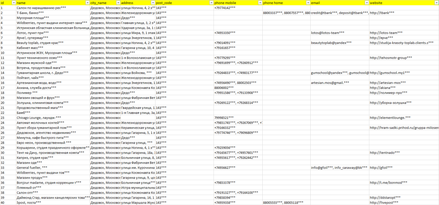 База компаний Дедовск, вся РФ в формате Excel с эл. почтами, телефонами, сайтами, ссылками на соц сети, координатами и другой информацией. Скачайте демо версию, чтобы ознакомиться с данными.