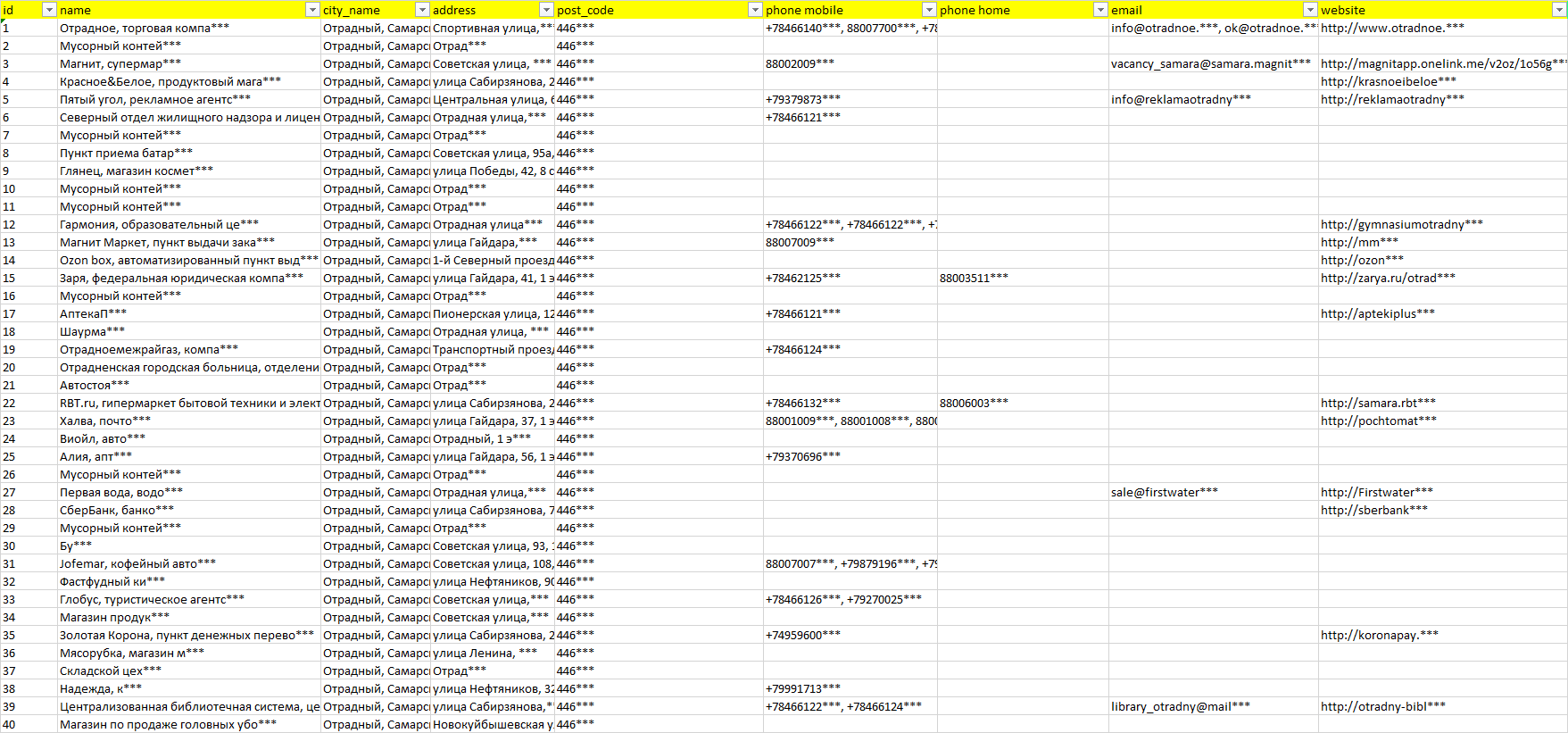 База организаций Отрадный, вся Россия в формате Excel с эл. почтами, телефонами, сайтами, ссылками на соц сети, координатами и другой информацией. Скачайте демо версию, чтобы ознакомиться с данными.