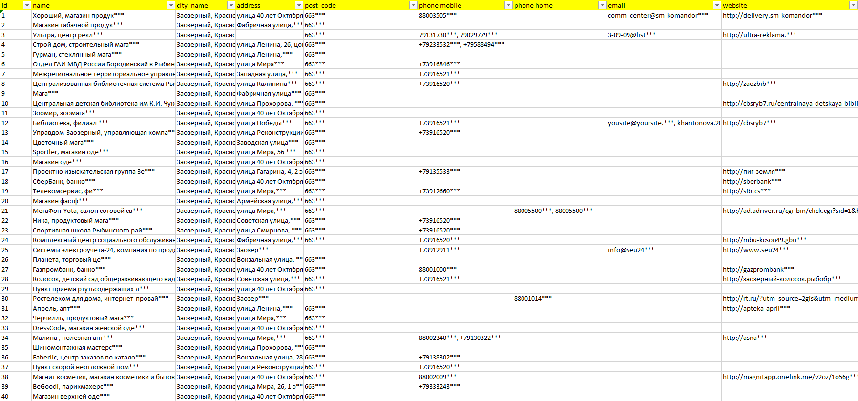 База компаний Заозерный, вся РФ в формате Excel с эл. почтами, телефонами, сайтами, ссылками на соц сети, координатами и другой информацией. Скачайте демо версию, чтобы ознакомиться с данными.