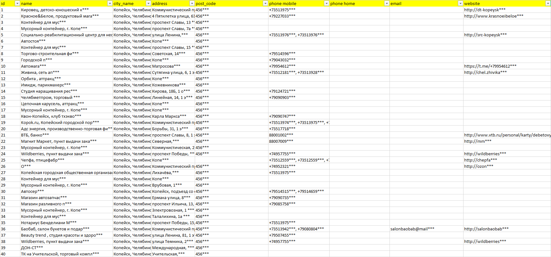 База организаций Копейск, вся Россия в формате Excel с эл. почтами, телефонами, сайтами, ссылками на соц сети, координатами и другой информацией. Скачайте демо версию, чтобы ознакомиться с данными.
