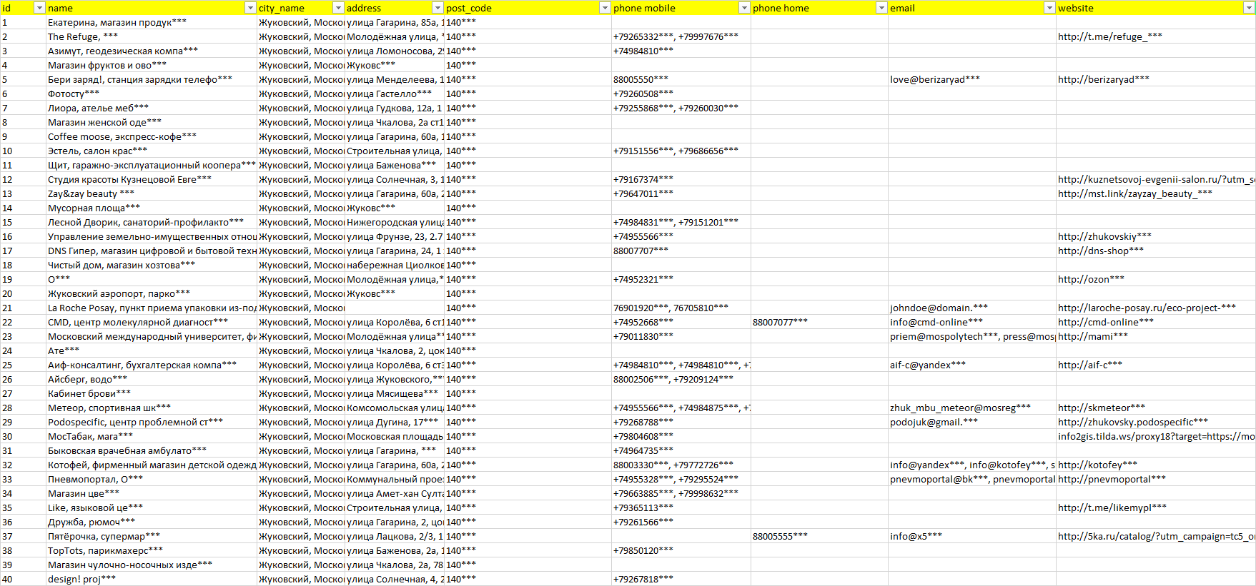 База организаций Жуковский, вся Россия в формате Excel с эл. почтами, телефонами, сайтами, ссылками на соц сети, координатами и другой информацией. Скачайте демо версию, чтобы ознакомиться с данными.