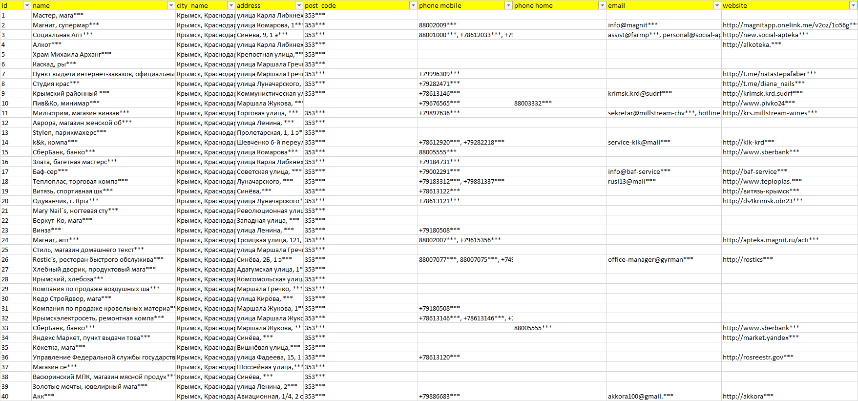 База компаний Крымск, вся РФ в формате Excel с эл. почтами, телефонами, сайтами, ссылками на соц сети, координатами и другой информацией. Скачайте демо версию, чтобы ознакомиться с данными.