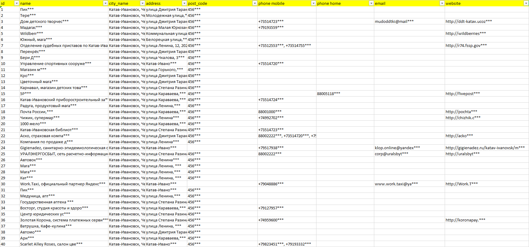 База компаний Катав-Ивановск, вся РФ в формате Excel с эл. почтами, телефонами, сайтами, ссылками на соц сети, координатами и другой информацией. Скачайте демо версию, чтобы ознакомиться с данными.