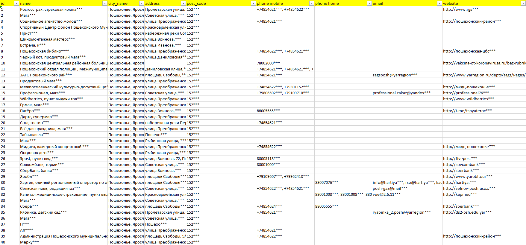 База организаций Пошехонье, вся Россия в формате Excel с эл. почтами, телефонами, сайтами, ссылками на соц сети, координатами и другой информацией. Скачайте демо версию, чтобы ознакомиться с данными.