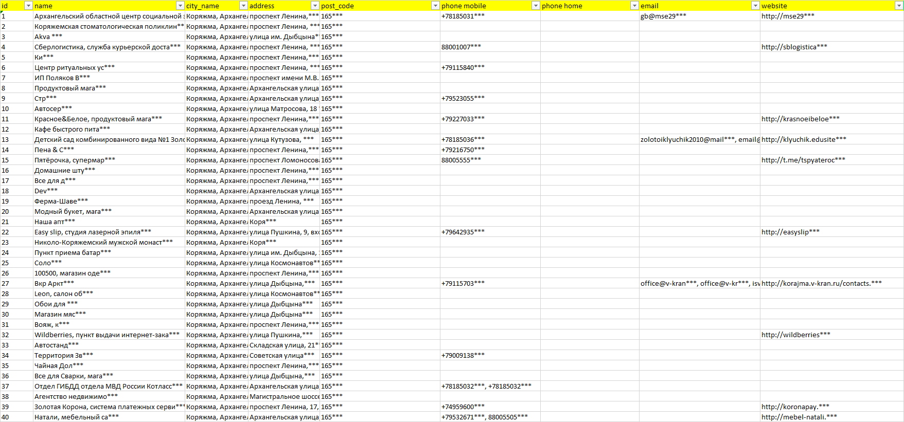 База компаний Коряжма, вся РФ в формате Excel с эл. почтами, телефонами, сайтами, ссылками на соц сети, координатами и другой информацией. Скачайте демо версию, чтобы ознакомиться с данными.