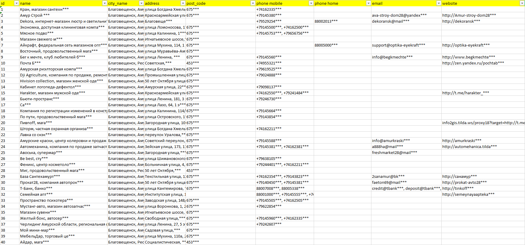 База компаний Благовещенск, вся РФ в формате Excel с эл. почтами, телефонами, сайтами, ссылками на соц сети, координатами и другой информацией. Скачайте демо версию, чтобы ознакомиться с данными.