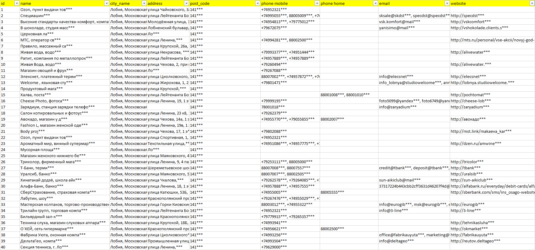 База организаций Лобня, вся Россия в формате Excel с эл. почтами, телефонами, сайтами, ссылками на соц сети, координатами и другой информацией. Скачайте демо версию, чтобы ознакомиться с данными.