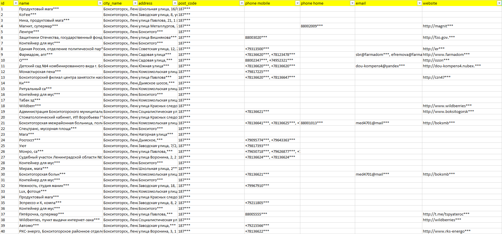 База компаний Бокситогорск, вся РФ в формате Excel с эл. почтами, телефонами, сайтами, ссылками на соц сети, координатами и другой информацией. Скачайте демо версию, чтобы ознакомиться с данными.