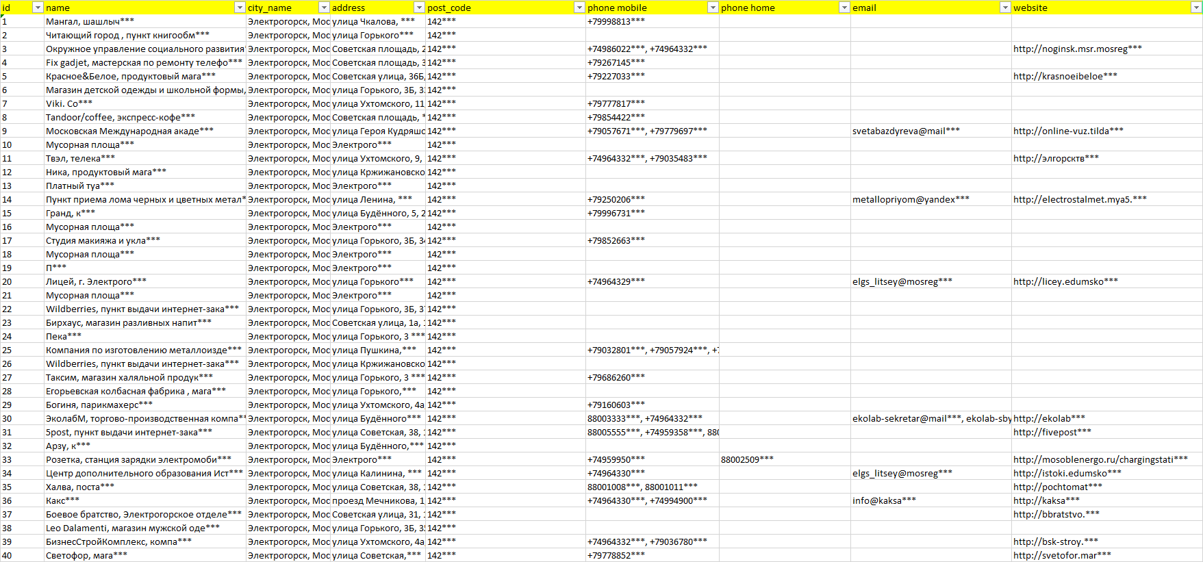 База компаний Электрогорск, вся РФ в формате Excel с эл. почтами, телефонами, сайтами, ссылками на соц сети, координатами и другой информацией. Скачайте демо версию, чтобы ознакомиться с данными.