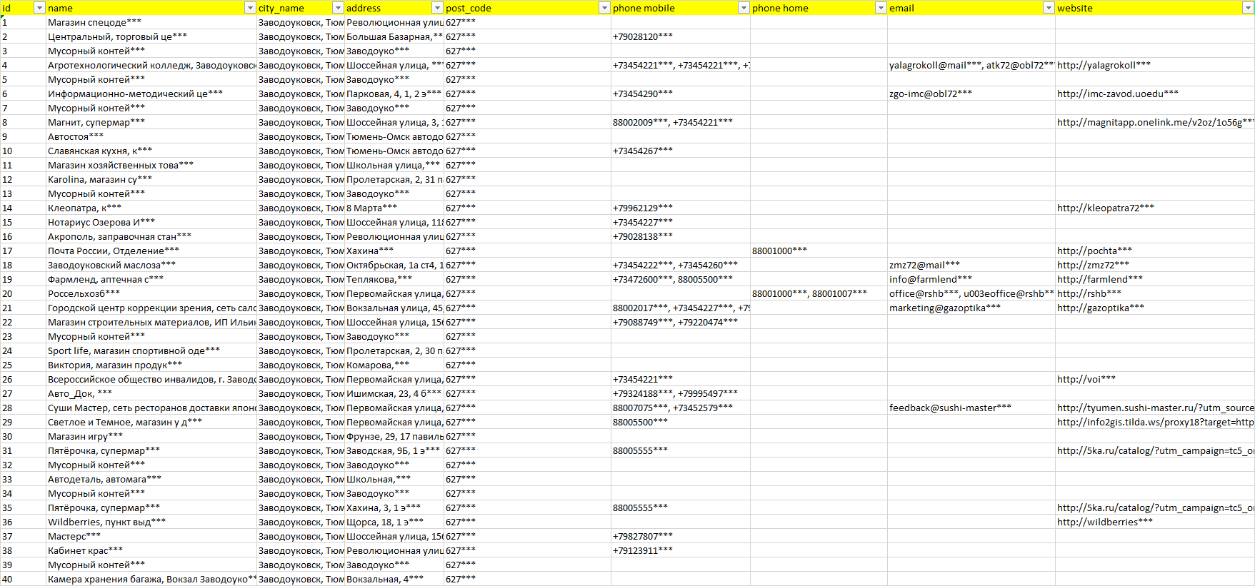 База организаций Заводоуковск, вся Россия в формате Excel с эл. почтами, телефонами, сайтами, ссылками на соц сети, координатами и другой информацией. Скачайте демо версию, чтобы ознакомиться с данными.