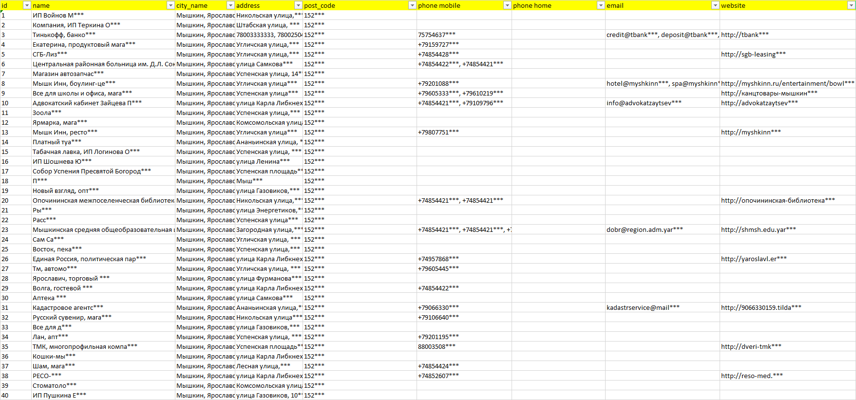 База компаний Мышкин, вся РФ в формате Excel с эл. почтами, телефонами, сайтами, ссылками на соц сети, координатами и другой информацией. Скачайте демо версию, чтобы ознакомиться с данными.