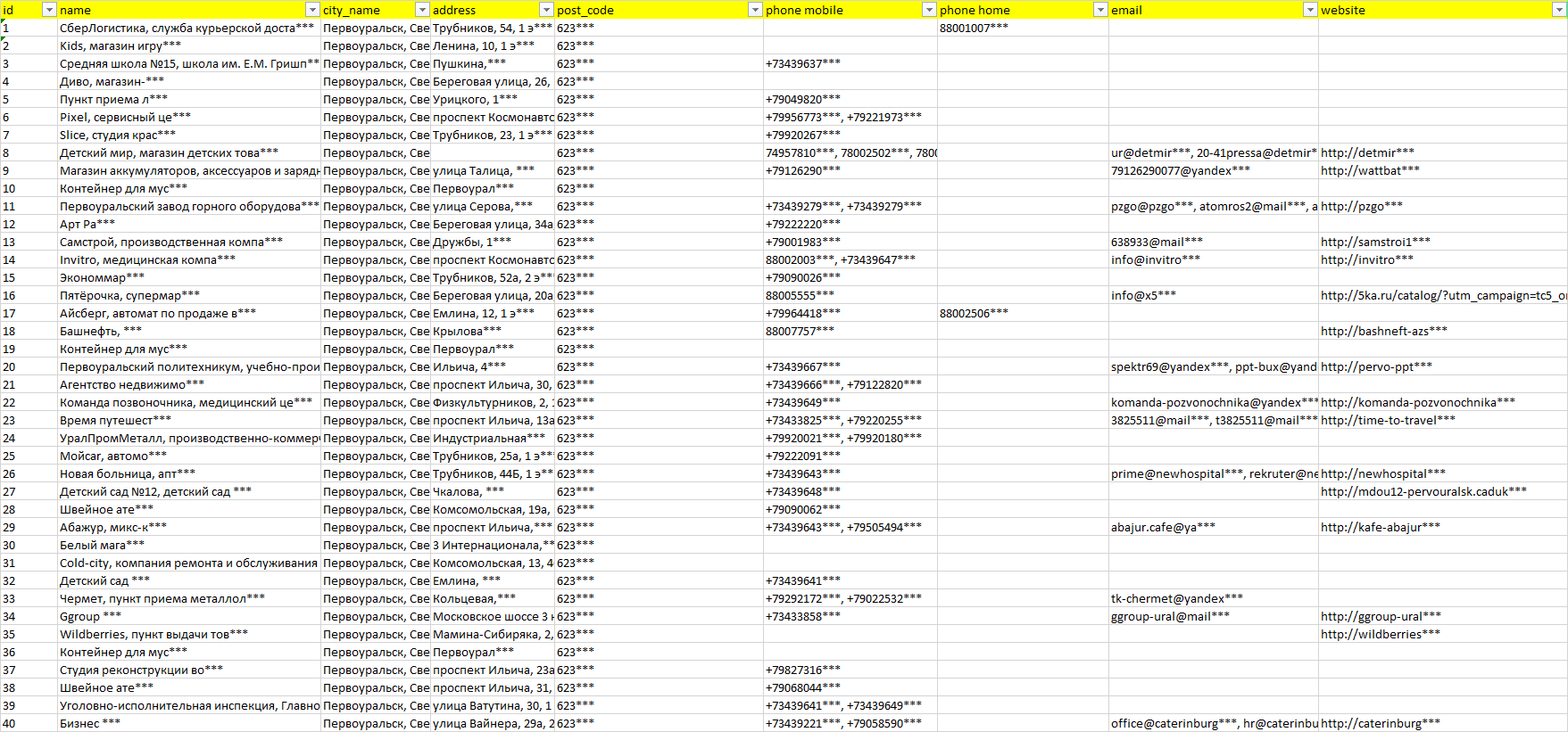 База организаций Первоуральск, вся Россия в формате Excel с эл. почтами, телефонами, сайтами, ссылками на соц сети, координатами и другой информацией. Скачайте демо версию, чтобы ознакомиться с данными.