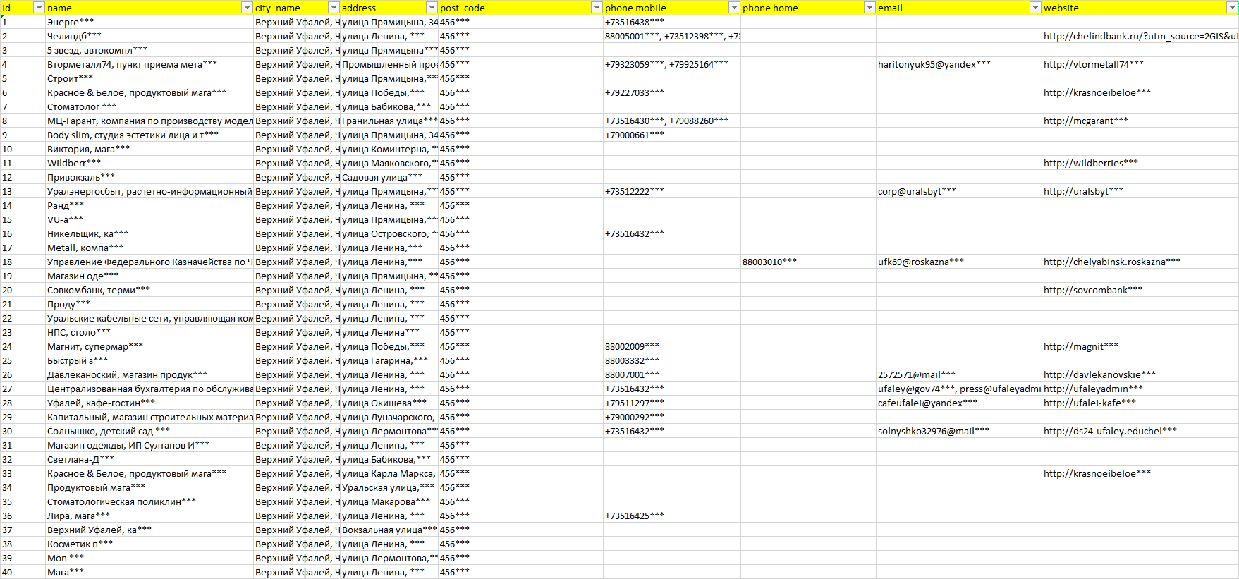 База компаний Верхний Уфалей, вся РФ в формате Excel с эл. почтами, телефонами, сайтами, ссылками на соц сети, координатами и другой информацией. Скачайте демо версию, чтобы ознакомиться с данными.