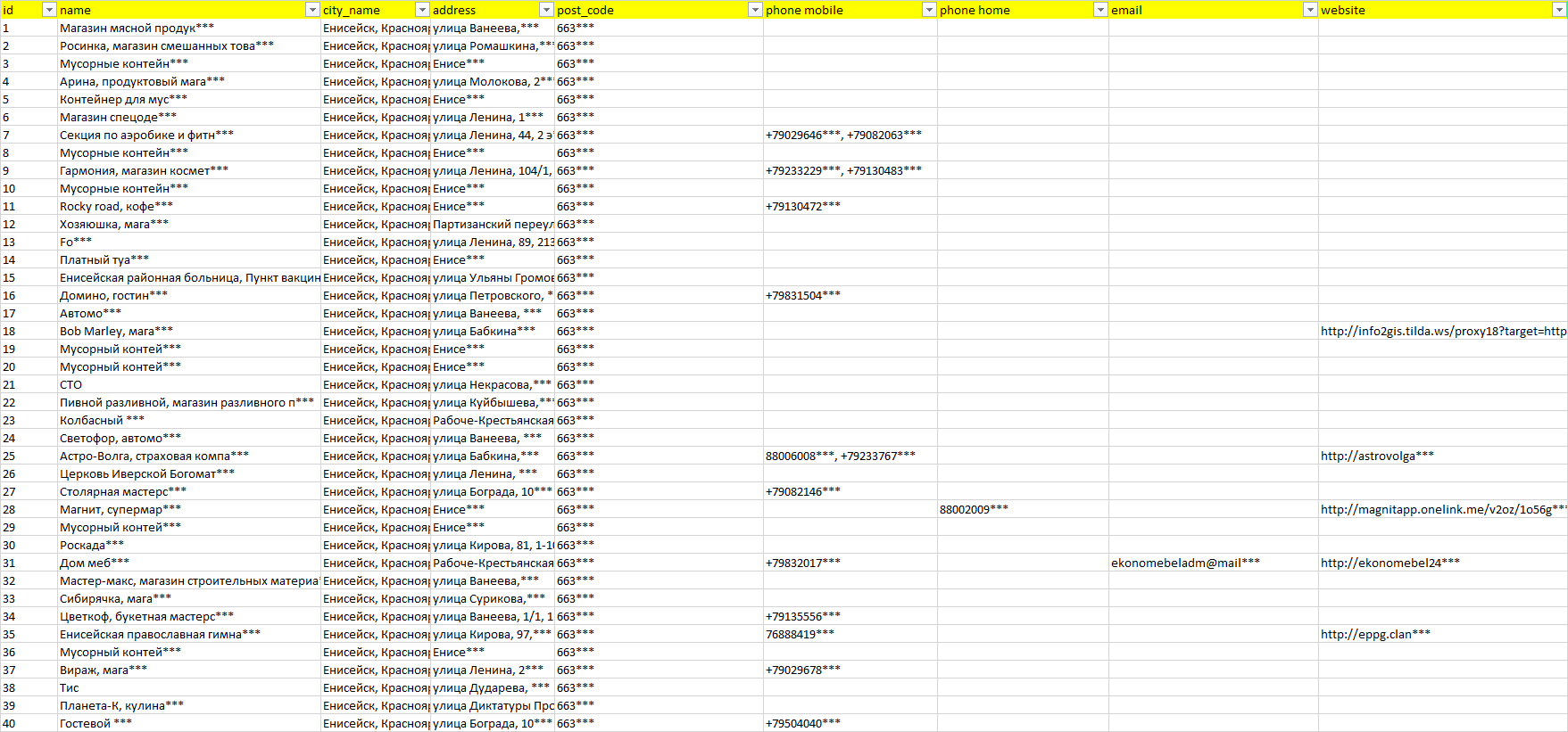 База организаций Енисейск, вся Россия в формате Excel с эл. почтами, телефонами, сайтами, ссылками на соц сети, координатами и другой информацией. Скачайте демо версию, чтобы ознакомиться с данными.