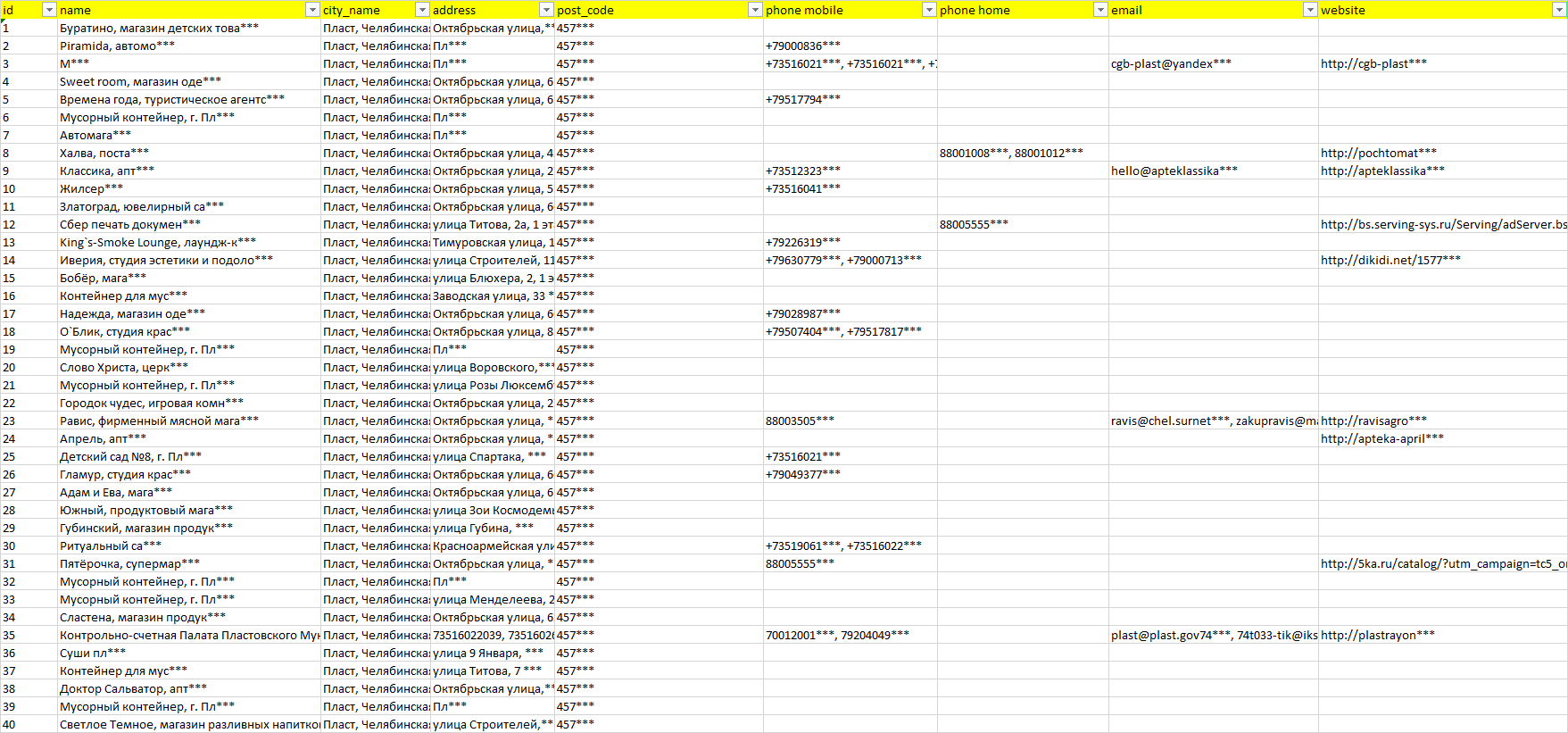 База организаций Пласт, вся Россия в формате Excel с эл. почтами, телефонами, сайтами, ссылками на соц сети, координатами и другой информацией. Скачайте демо версию, чтобы ознакомиться с данными.