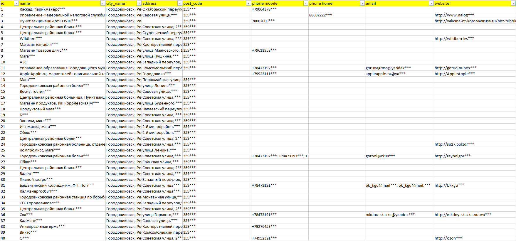 База компаний Городовиковск, вся РФ в формате Excel с эл. почтами, телефонами, сайтами, ссылками на соц сети, координатами и другой информацией. Скачайте демо версию, чтобы ознакомиться с данными.
