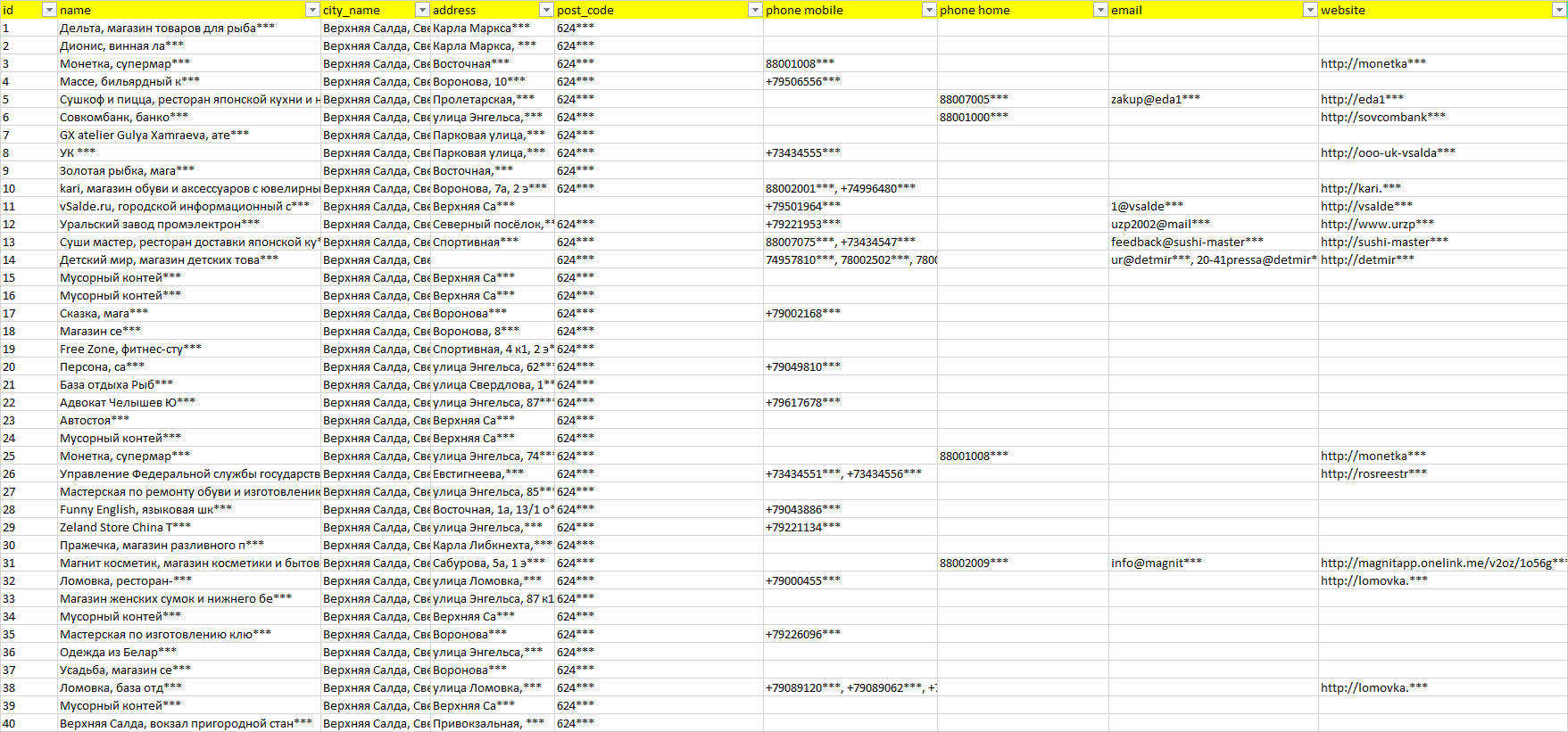 База организаций Верхняя Салда, вся Россия в формате Excel с эл. почтами, телефонами, сайтами, ссылками на соц сети, координатами и другой информацией. Скачайте демо версию, чтобы ознакомиться с данными.