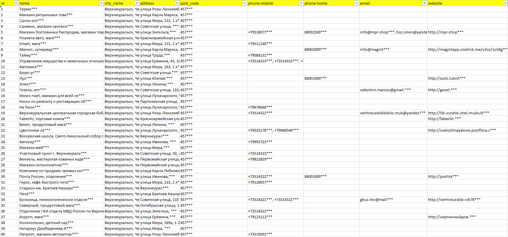База организаций Верхнеуральск, вся Россия в формате Excel с эл. почтами, телефонами, сайтами, ссылками на соц сети, координатами и другой информацией. Скачайте демо версию, чтобы ознакомиться с данными.