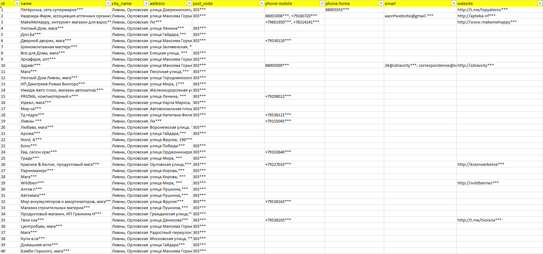 База организаций Ливны, вся Россия в формате Excel с эл. почтами, телефонами, сайтами, ссылками на соц сети, координатами и другой информацией. Скачайте демо версию, чтобы ознакомиться с данными.
