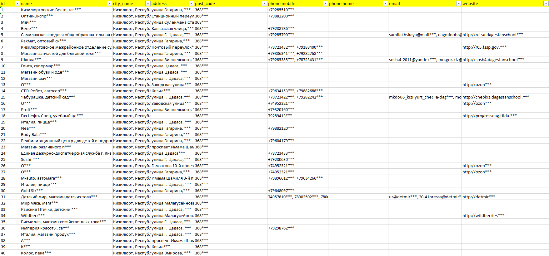 База компаний Кизилюрт, вся РФ в формате Excel с эл. почтами, телефонами, сайтами, ссылками на соц сети, координатами и другой информацией. Скачайте демо версию, чтобы ознакомиться с данными.
