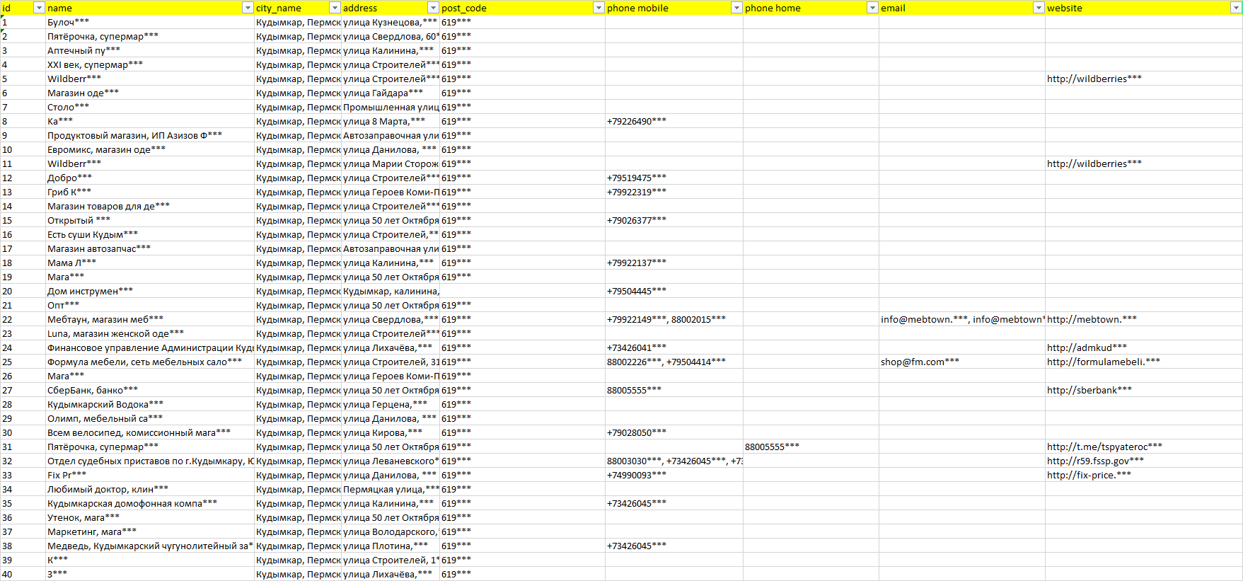 База организаций Кудымкар, вся Россия в формате Excel с эл. почтами, телефонами, сайтами, ссылками на соц сети, координатами и другой информацией. Скачайте демо версию, чтобы ознакомиться с данными.