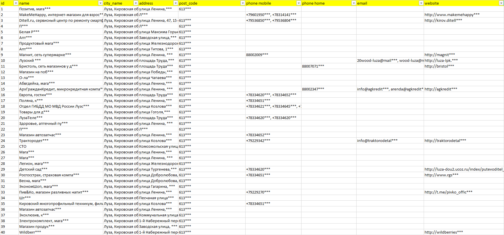 База компаний Луза, вся РФ в формате Excel с эл. почтами, телефонами, сайтами, ссылками на соц сети, координатами и другой информацией. Скачайте демо версию, чтобы ознакомиться с данными.