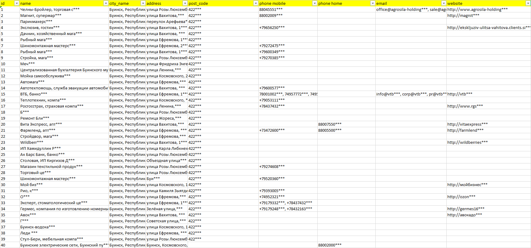 База организаций Буинск, вся Россия в формате Excel с эл. почтами, телефонами, сайтами, ссылками на соц сети, координатами и другой информацией. Скачайте демо версию, чтобы ознакомиться с данными.