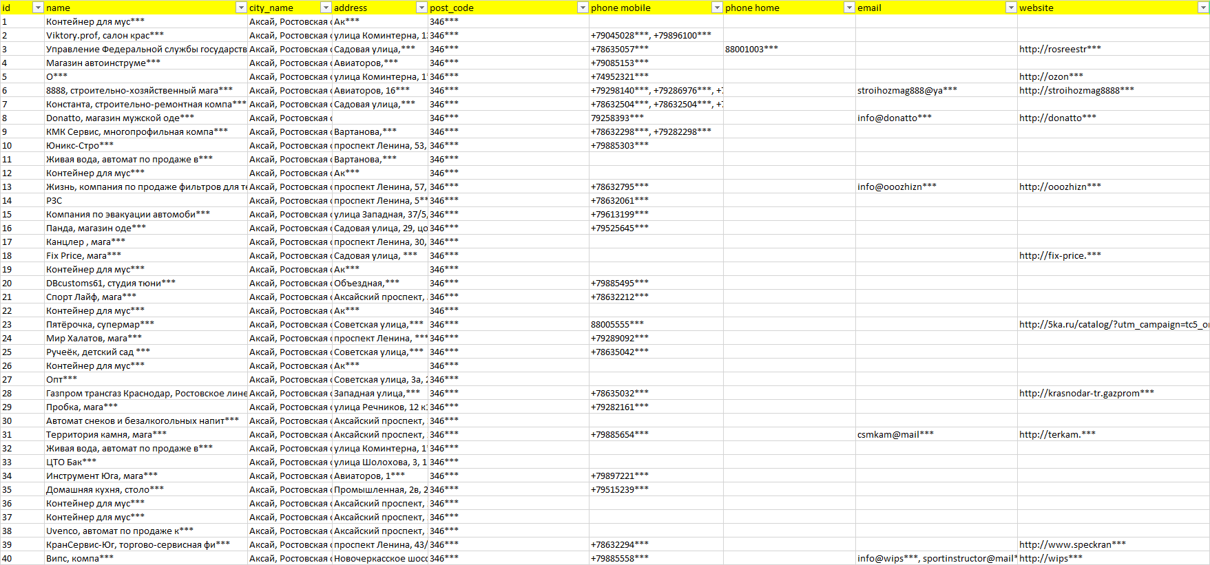 База организаций Аксай, вся Россия в формате Excel с эл. почтами, телефонами, сайтами, ссылками на соц сети, координатами и другой информацией. Скачайте демо версию, чтобы ознакомиться с данными.