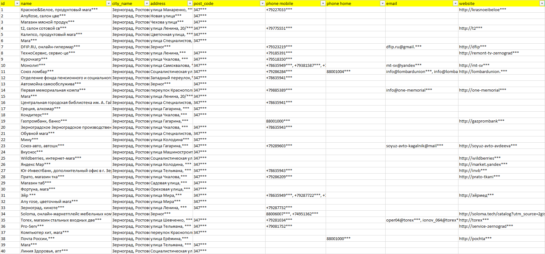 База организаций Зерноград, вся Россия в формате Excel с эл. почтами, телефонами, сайтами, ссылками на соц сети, координатами и другой информацией. Скачайте демо версию, чтобы ознакомиться с данными.