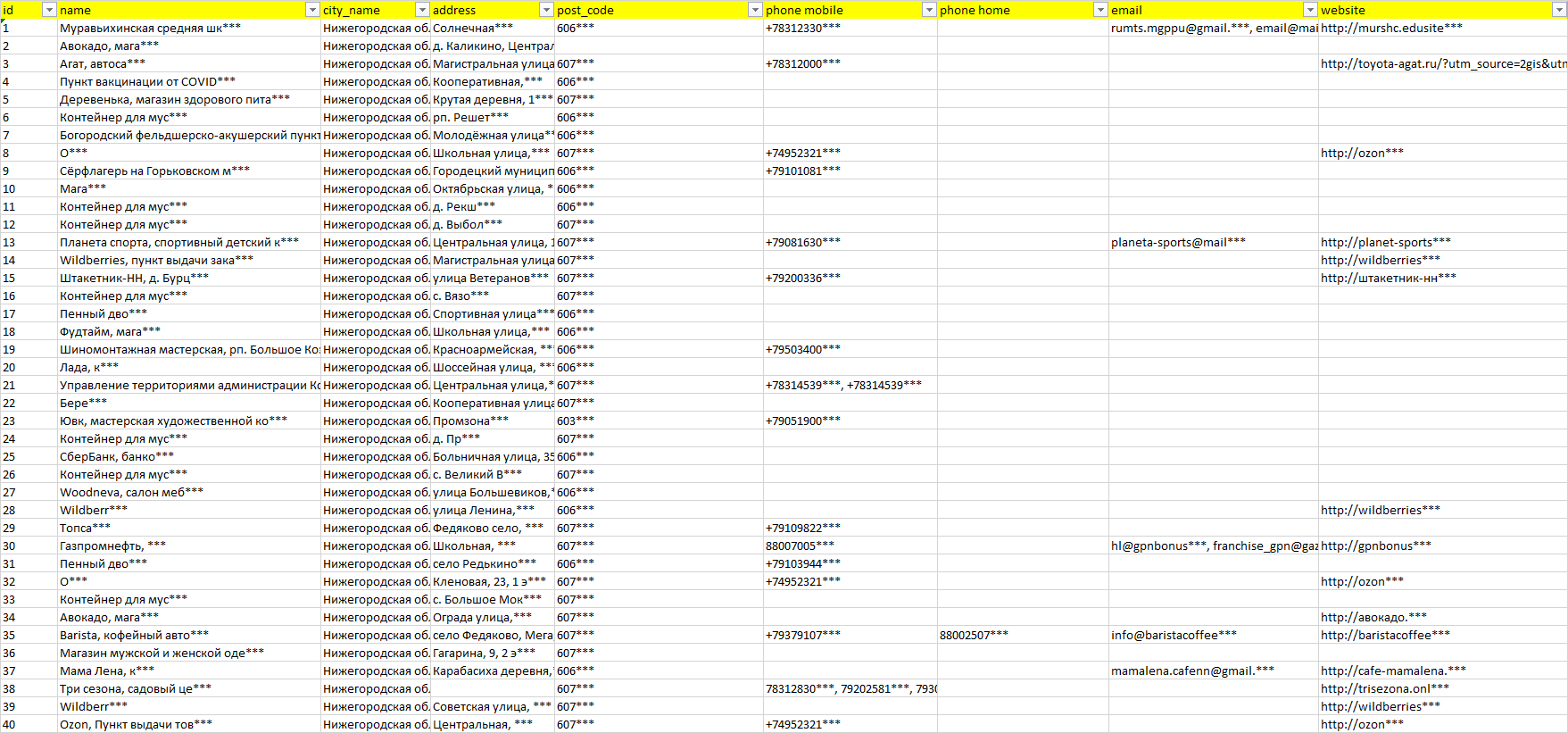 База компаний Нижегородская область, вся РФ в формате Excel с эл. почтами, телефонами, сайтами, ссылками на соц сети, координатами и другой информацией. Скачайте демо версию, чтобы ознакомиться с данными.