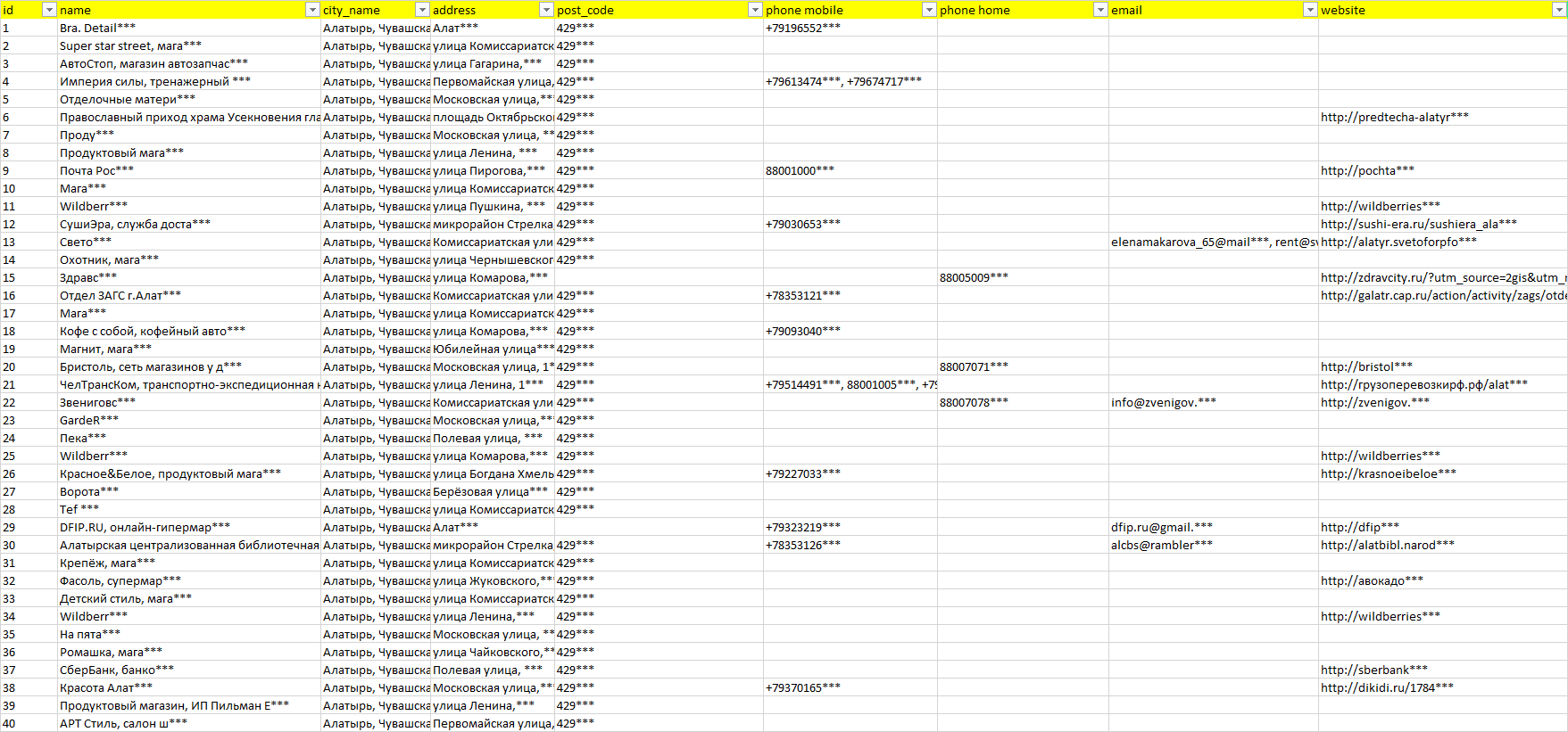 База организаций Алатырь, вся Россия в формате Excel с эл. почтами, телефонами, сайтами, ссылками на соц сети, координатами и другой информацией. Скачайте демо версию, чтобы ознакомиться с данными.