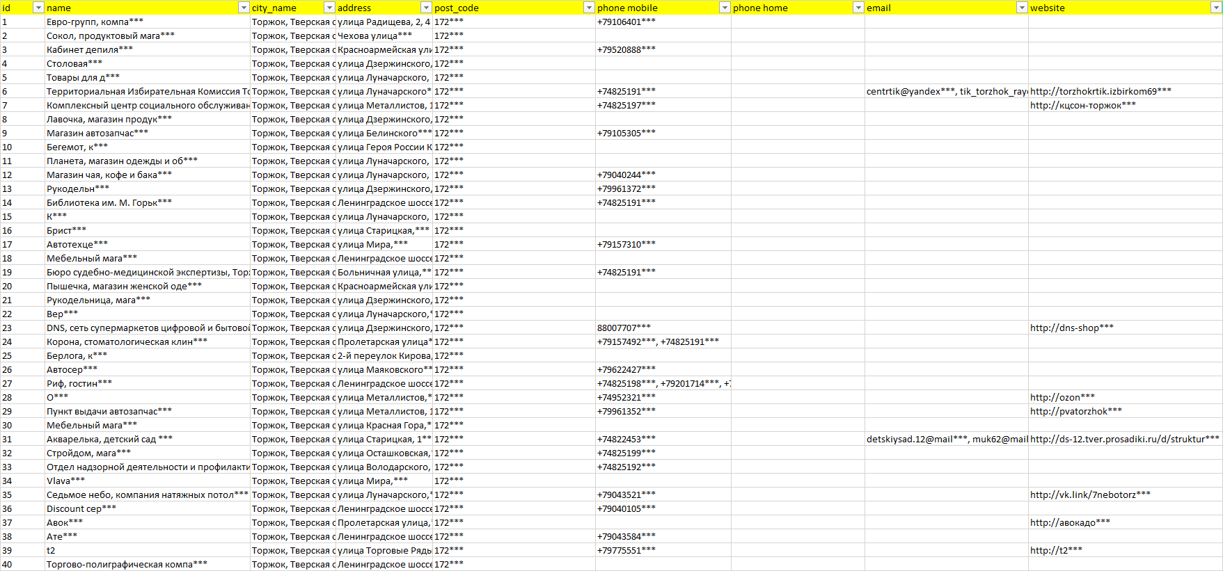 База компаний Торжок, вся РФ в формате Excel с эл. почтами, телефонами, сайтами, ссылками на соц сети, координатами и другой информацией. Скачайте демо версию, чтобы ознакомиться с данными.