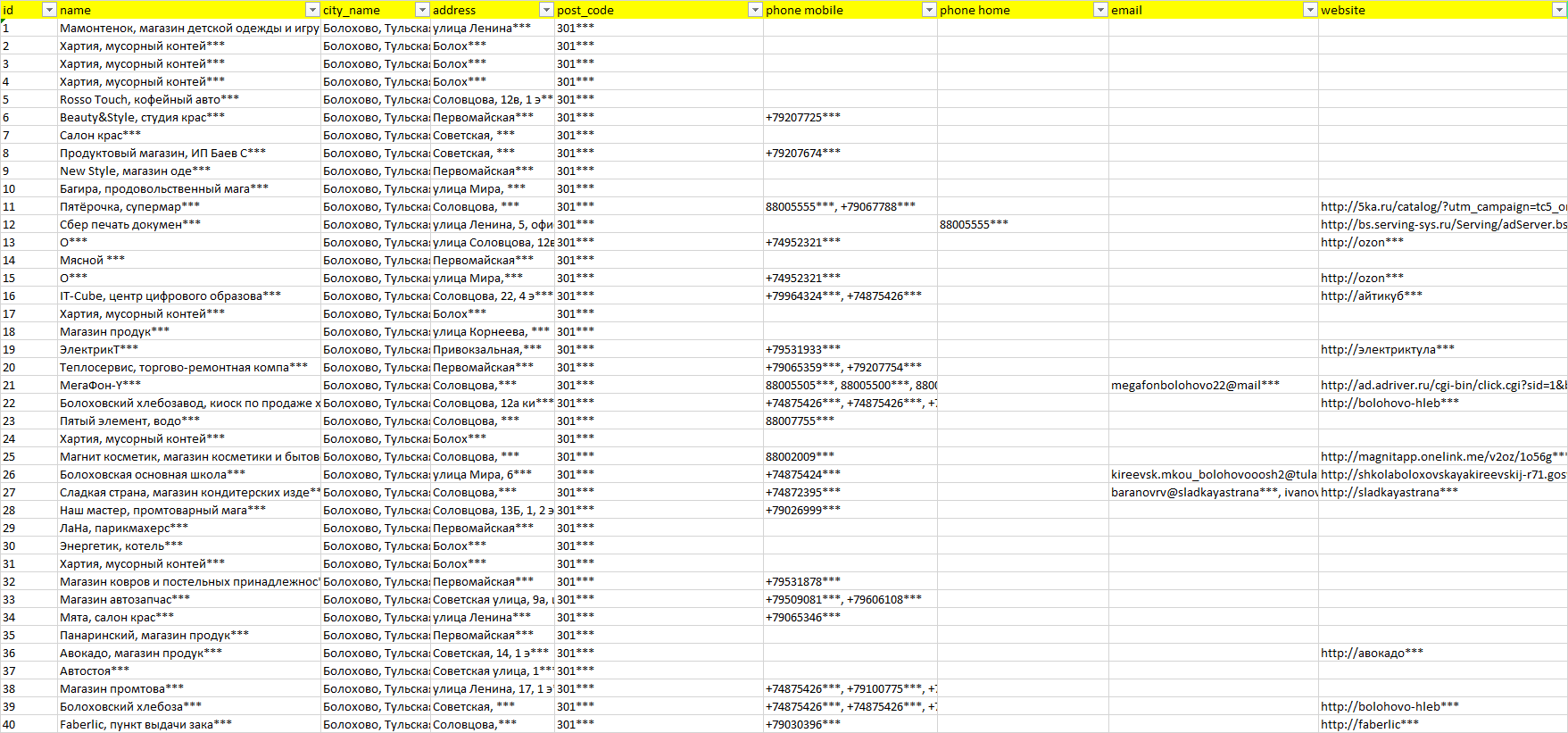 База компаний Болохово, вся РФ в формате Excel с эл. почтами, телефонами, сайтами, ссылками на соц сети, координатами и другой информацией. Скачайте демо версию, чтобы ознакомиться с данными.
