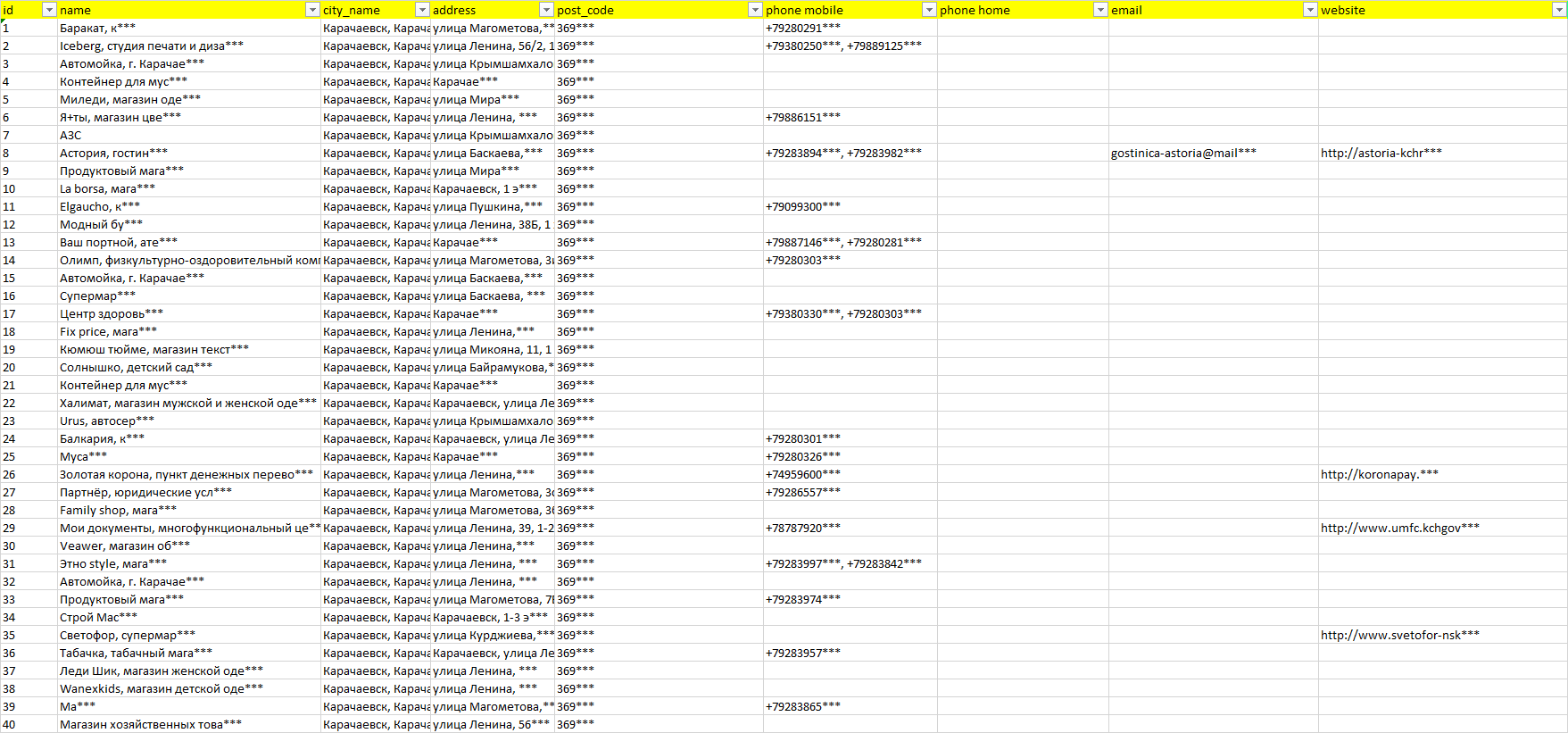 База компаний Карачаевск, вся РФ в формате Excel с эл. почтами, телефонами, сайтами, ссылками на соц сети, координатами и другой информацией. Скачайте демо версию, чтобы ознакомиться с данными.