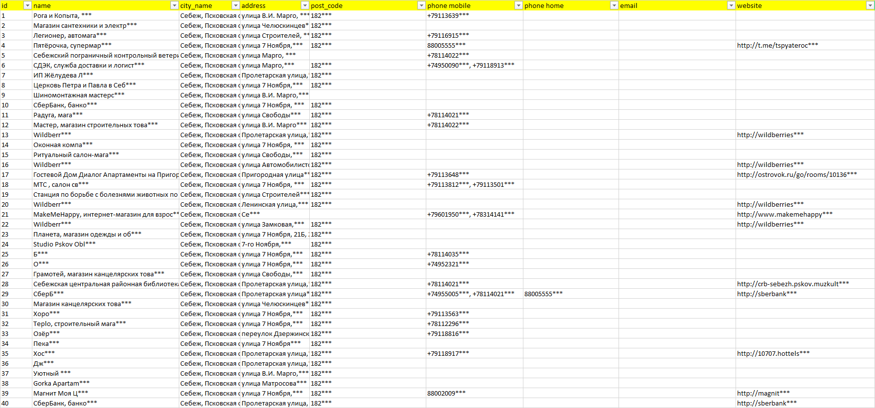 База организаций Себеж, вся Россия в формате Excel с эл. почтами, телефонами, сайтами, ссылками на соц сети, координатами и другой информацией. Скачайте демо версию, чтобы ознакомиться с данными.