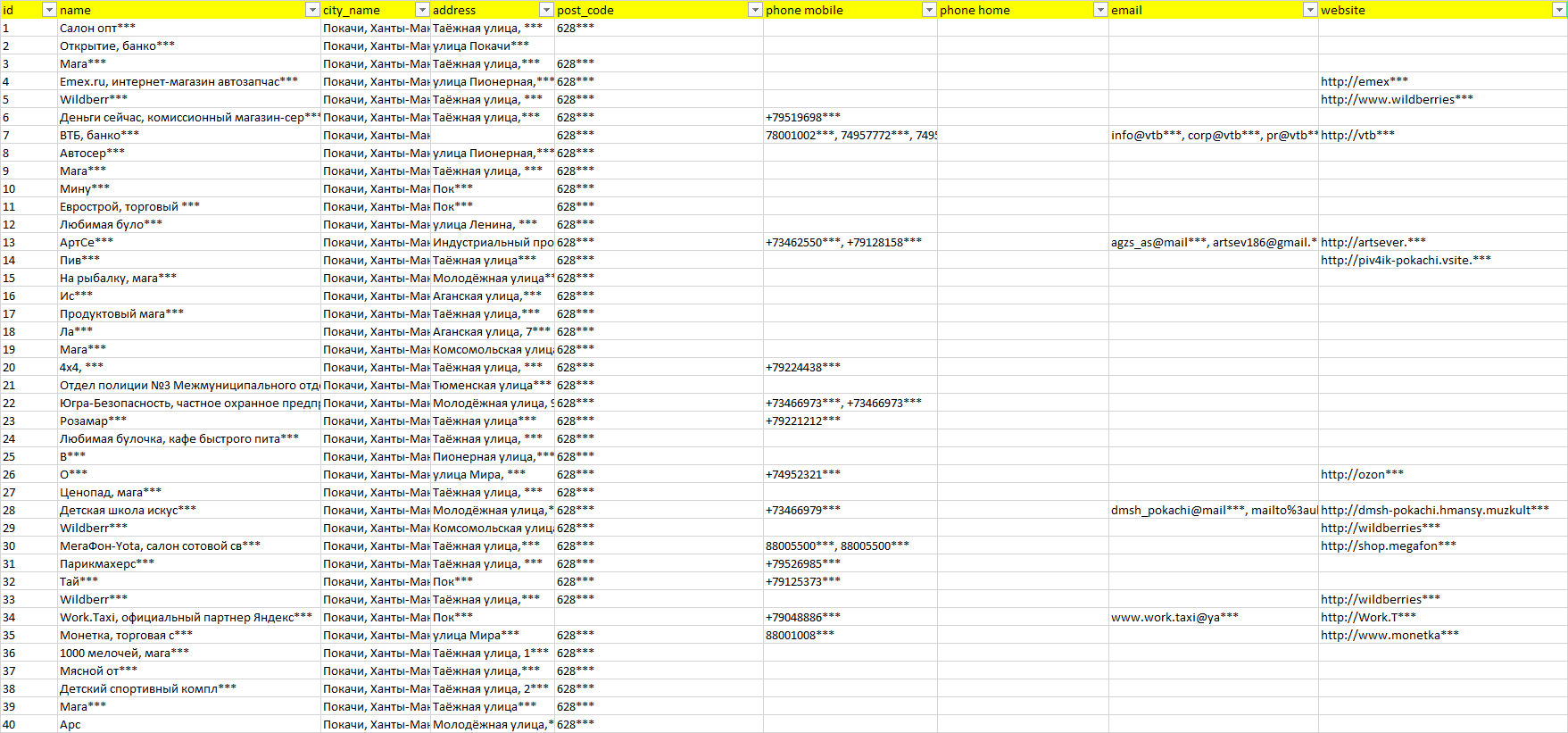 База организаций Покачи, вся Россия в формате Excel с эл. почтами, телефонами, сайтами, ссылками на соц сети, координатами и другой информацией. Скачайте демо версию, чтобы ознакомиться с данными.